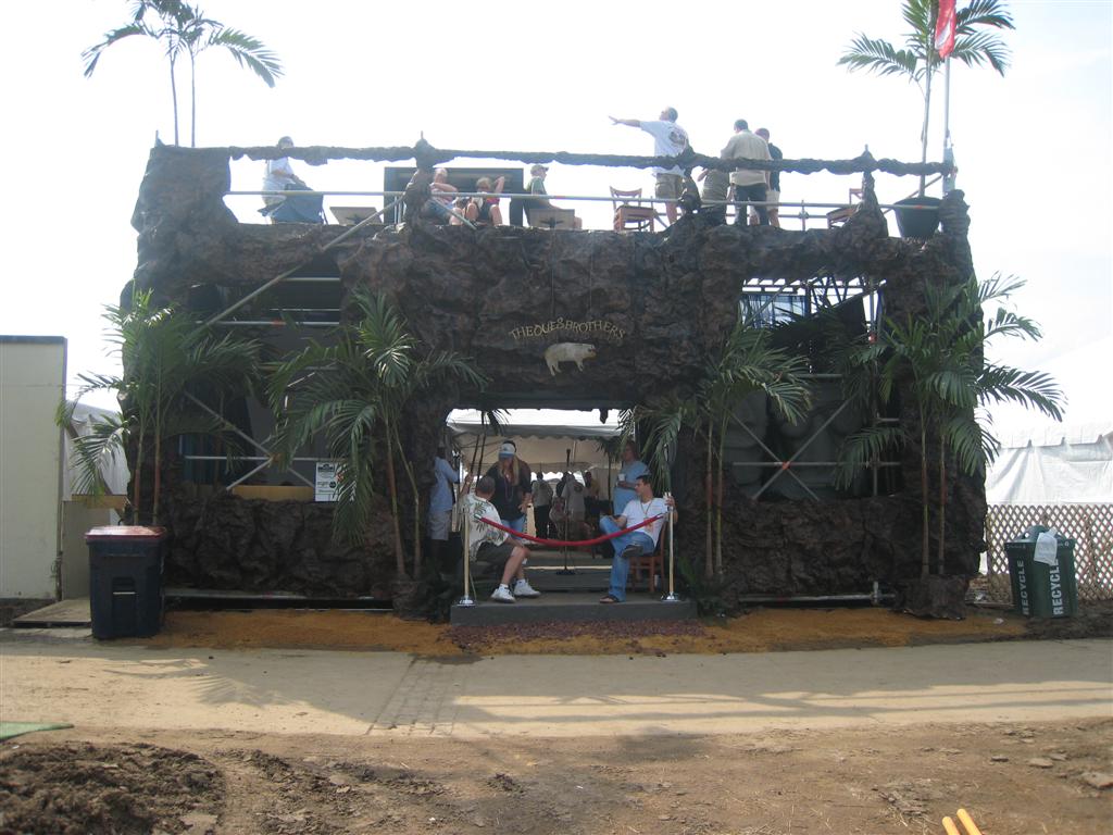 Pictures from last year: One of the booths decorated as Easter Island, Tent City on a beautiful day, sunset on a tent rooftop then partying on another, food glorious food, a whole hog awaits judging, one of the party nights (always rockin), Miss Piggy Idol contest.